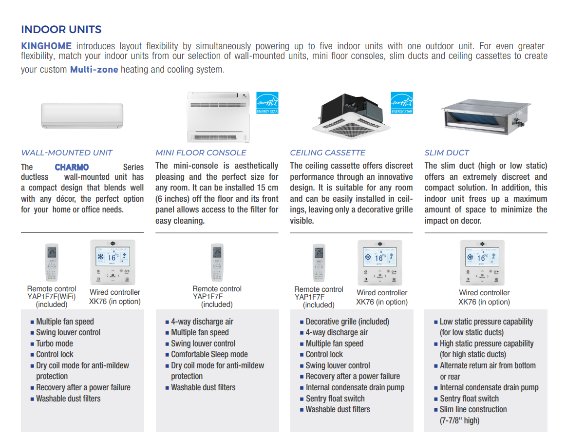 Enjoy efficient whole-house comfort with highly versatile multi-zone systems that can meet the comfort needs of everyone and every room in your home. KINGHOME’s Multi-zone series provides both cooling and heating in as many as five distinct zones independently.